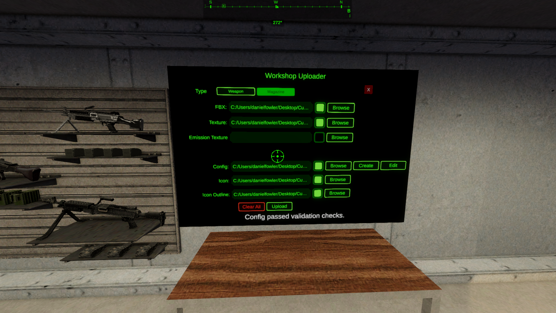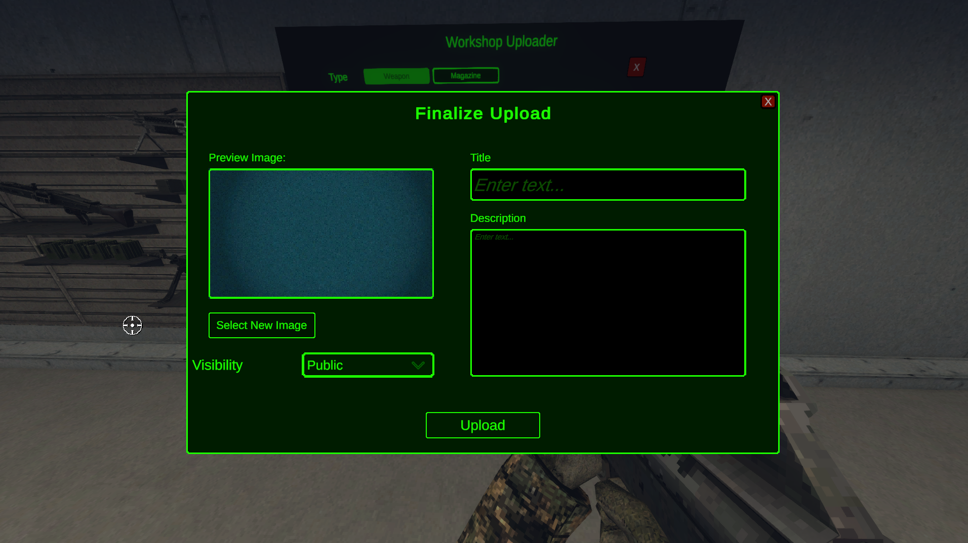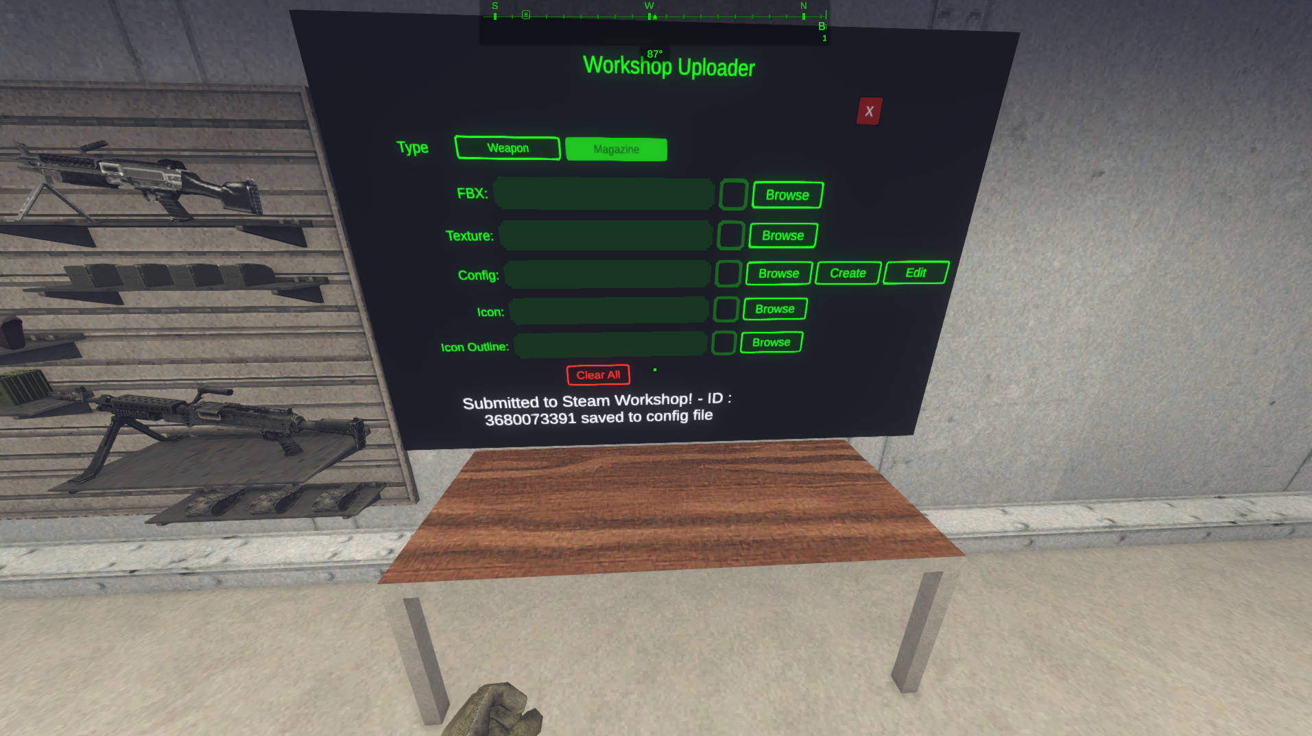 To upload a magazine, head back to the armory in the game. Go to the Custom Weapon Table. Select “Upload Item” and make sure you have the “Magazine” type selected.