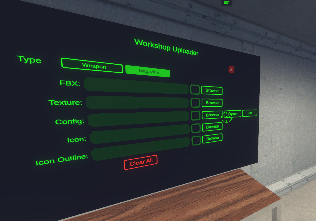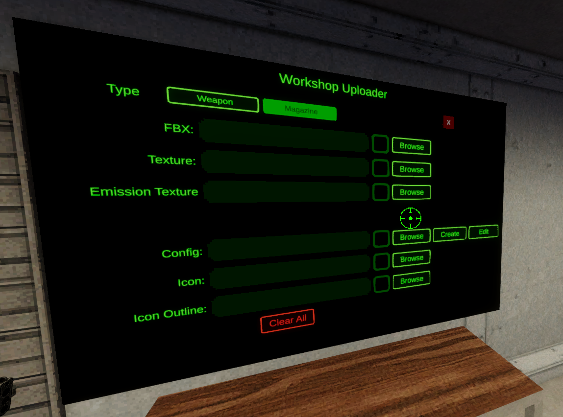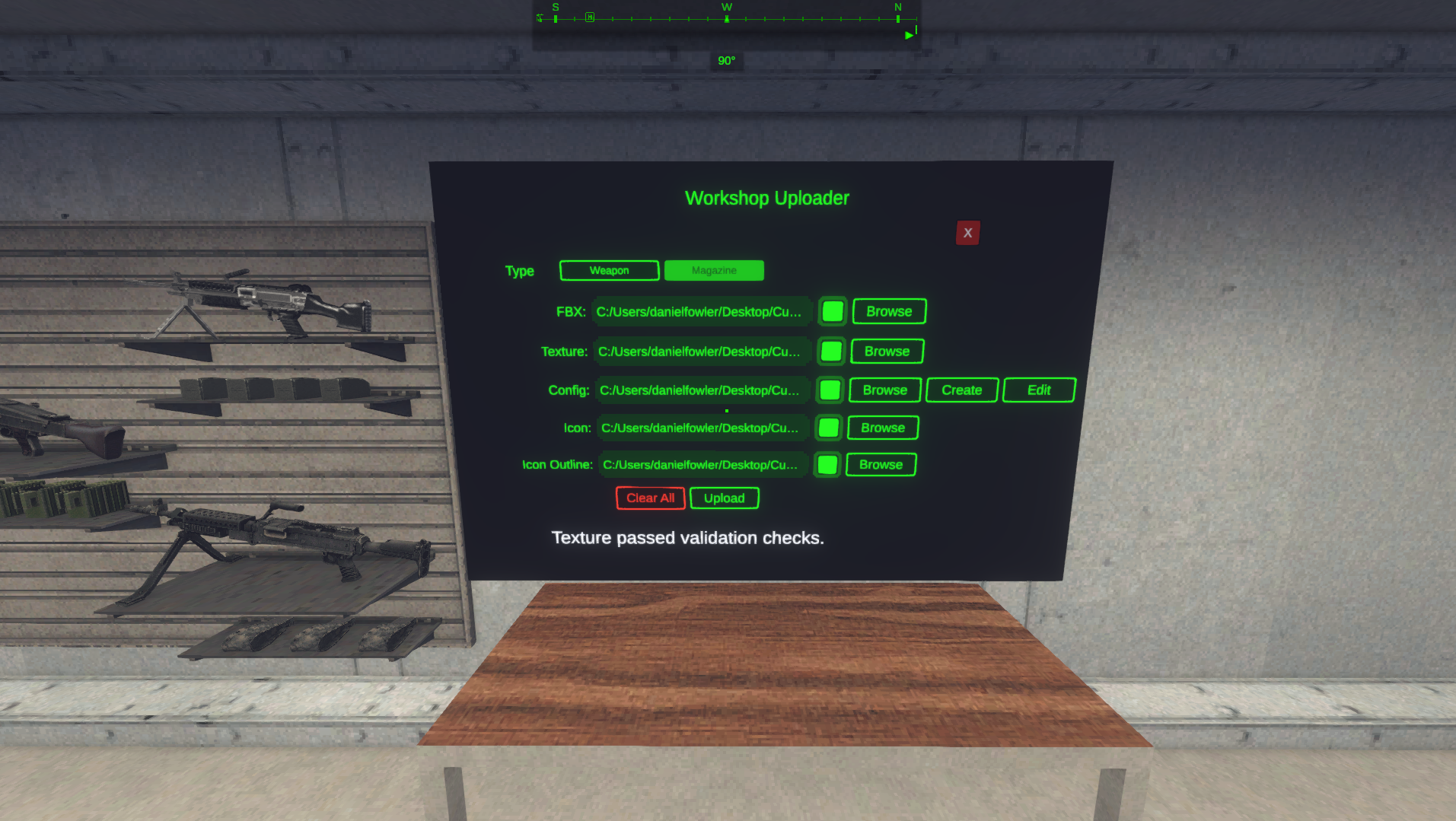 To upload a magazine, head back to the armory in the game. Go to the Custom Weapon Table. Select “Upload Item” and make sure you have the “Magazine” type selected.