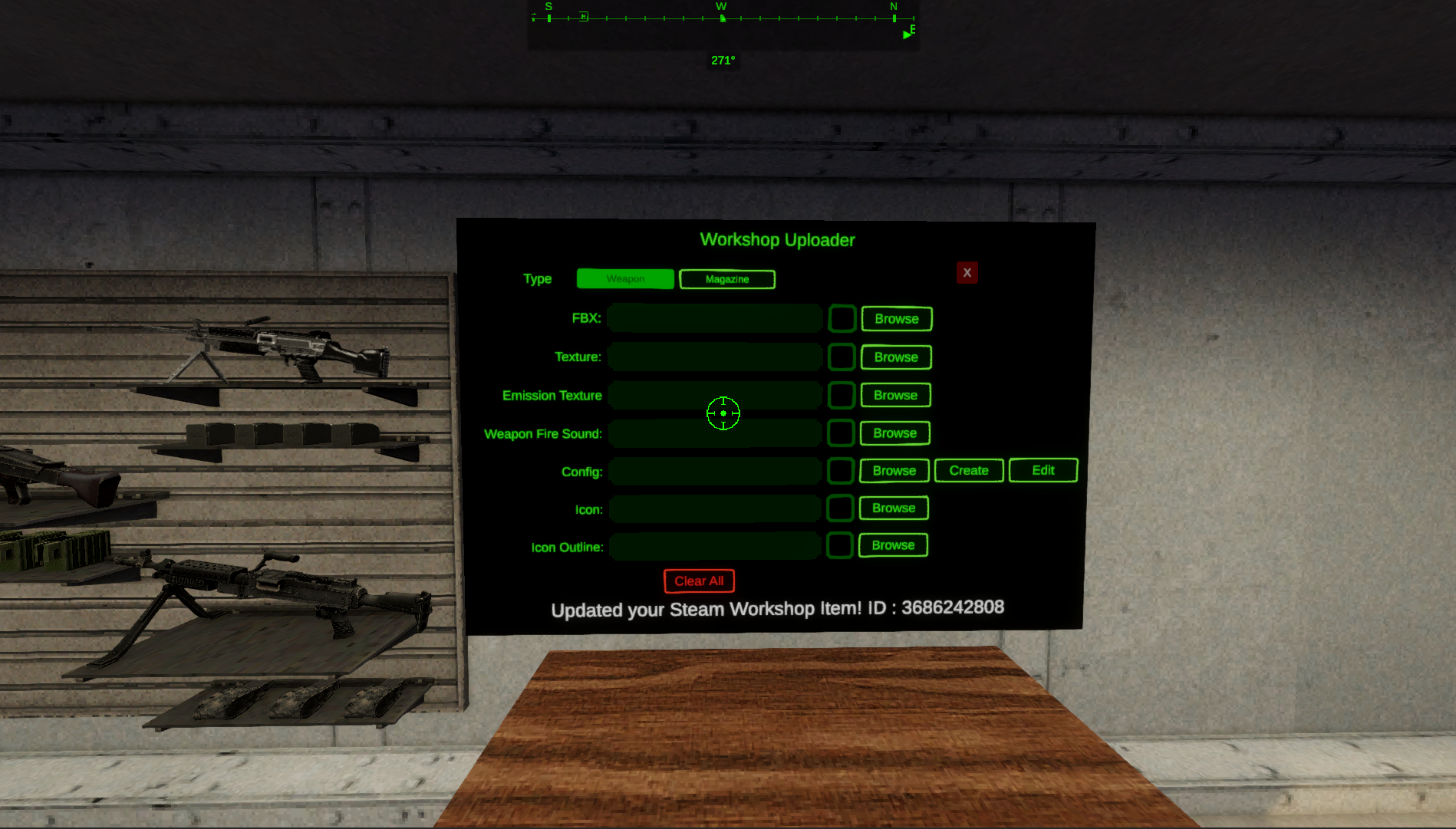 The ID is saved to the config file when you initially uploaded it. If you’ve lost that file, don’t worry you can find it by looking at the Steam Workshop page for your weapon. The ID is in the path.
