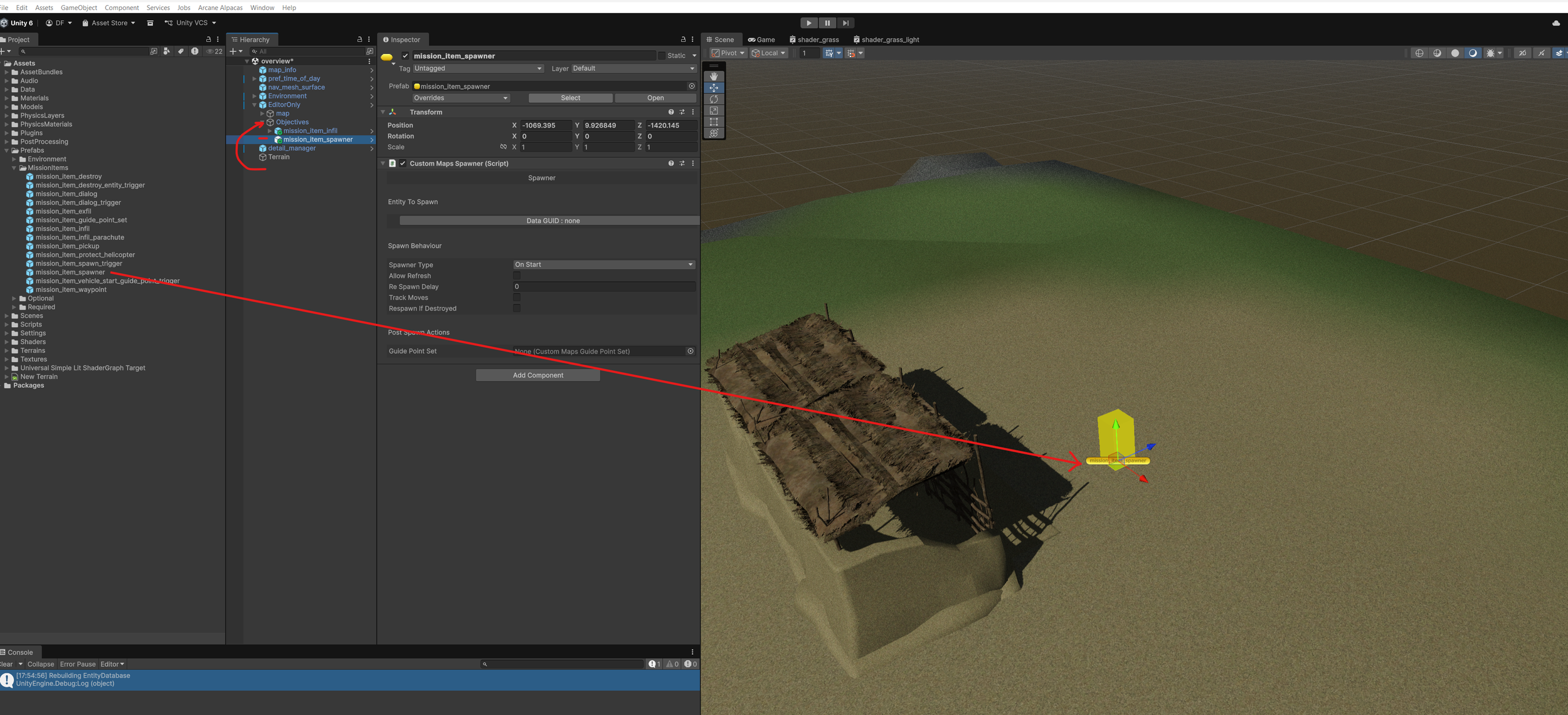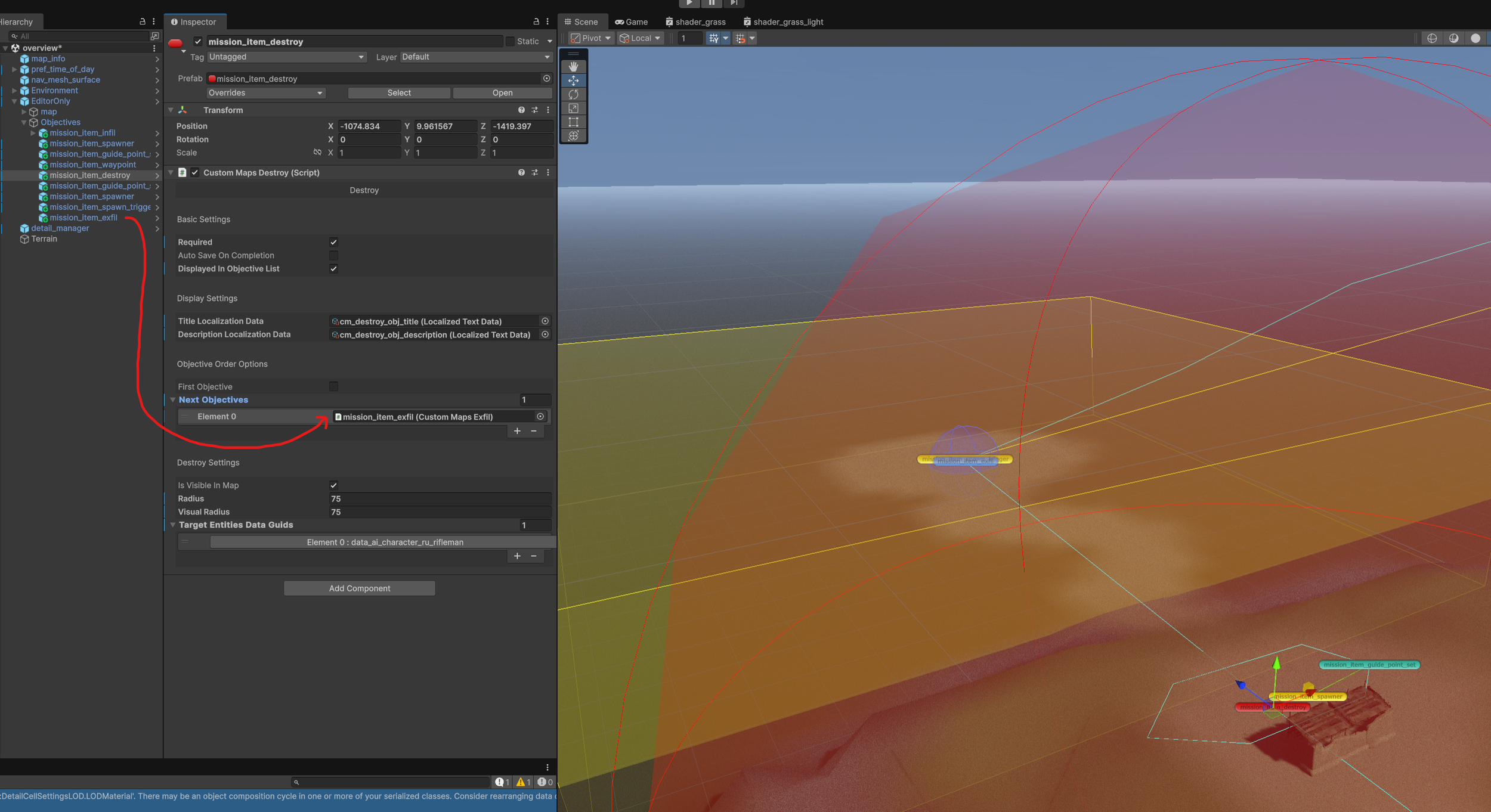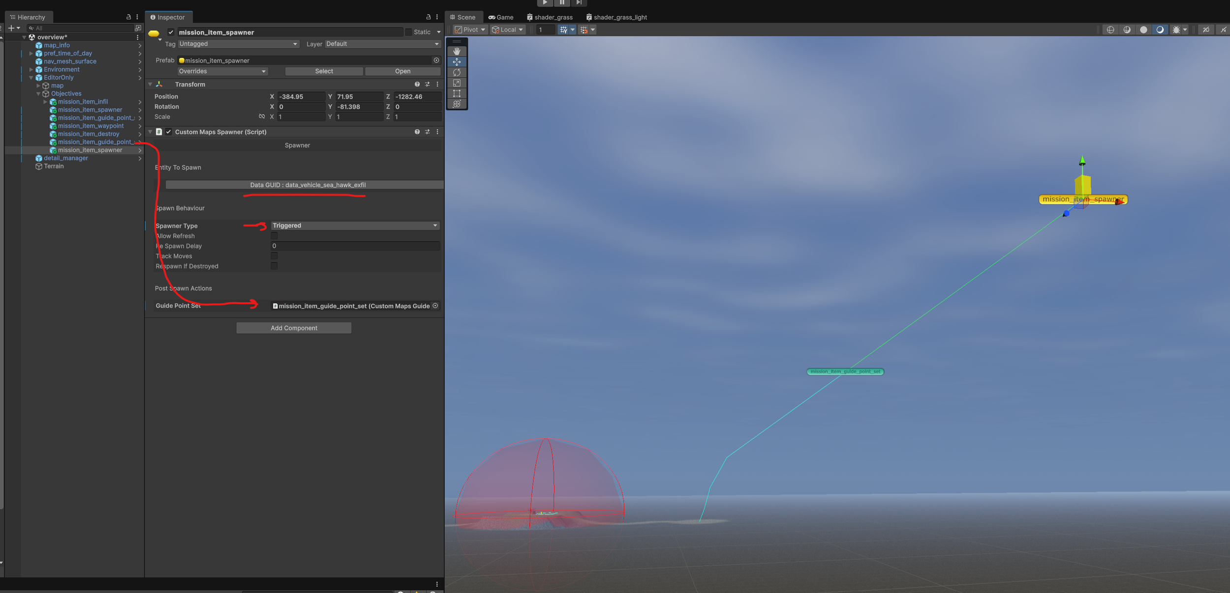 3: Next we’ll place an enemy spawn point. Same as the infil point, find “mission_item_spawner” and drag it into the scene. Again parent it to the “Objectives” object.