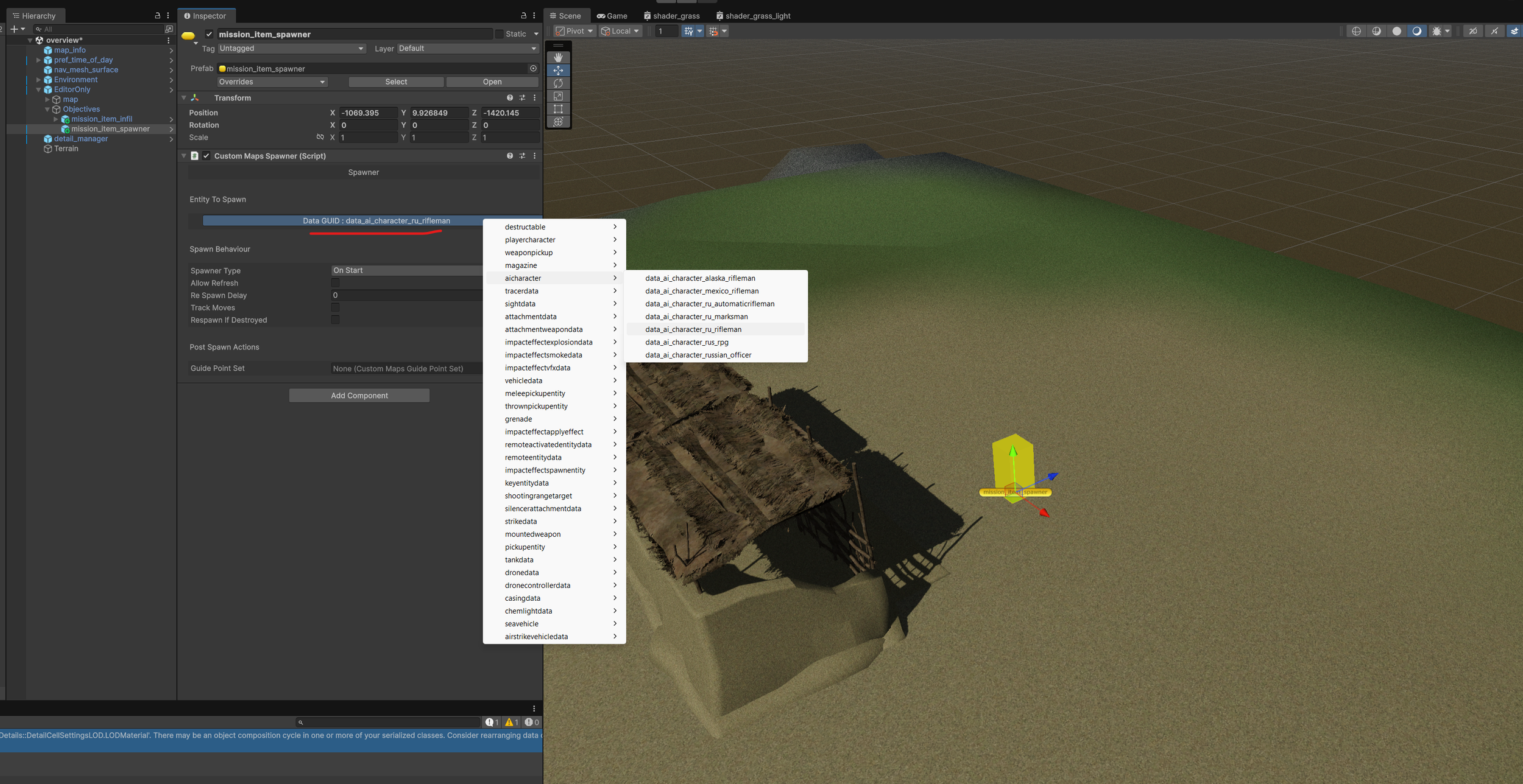4: Let’s select an enemy to spawn there now. With the spawner selected, click the button under “Entity To Spawn”. Find the “AI Characters” and select “data_ai_character_ru_rifleman”.
