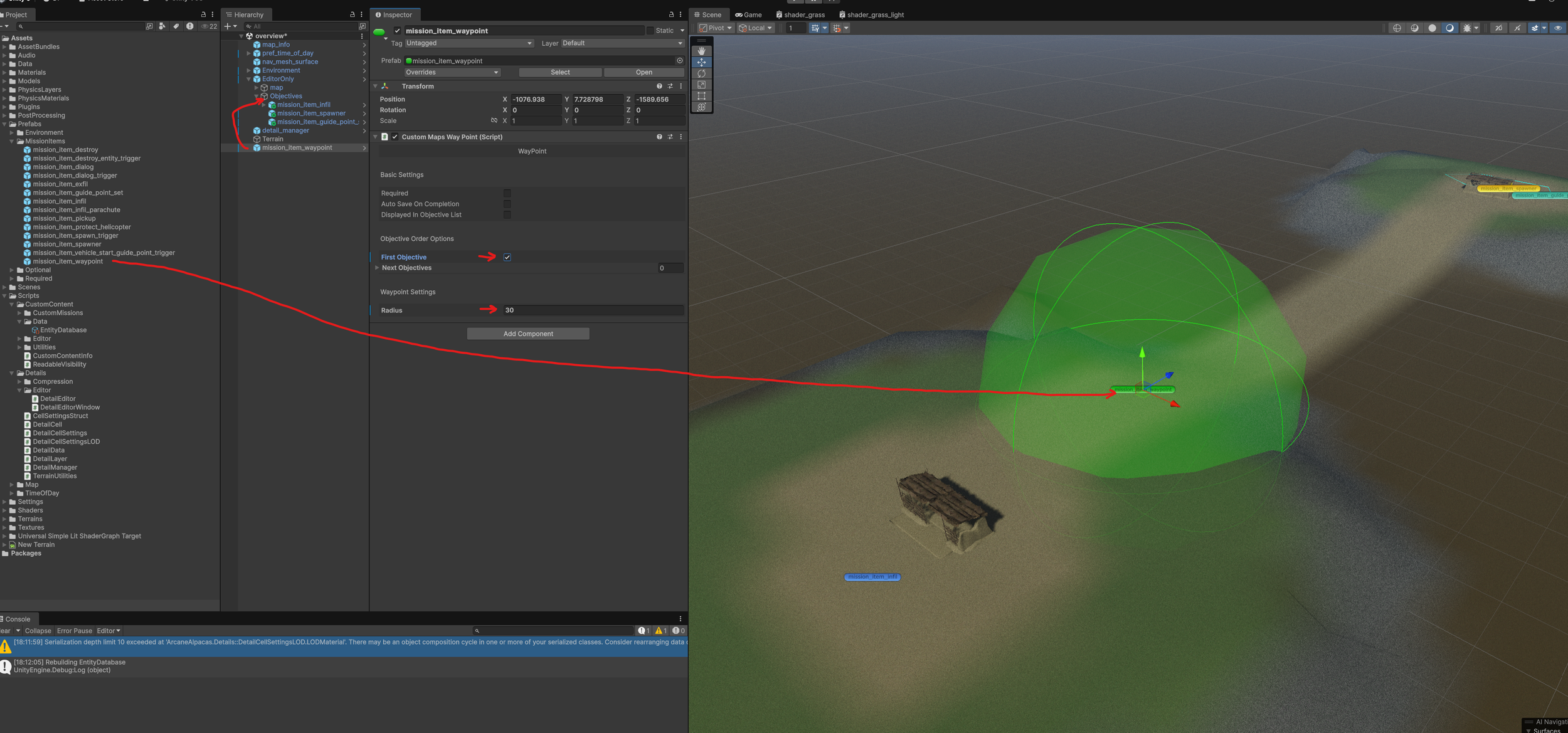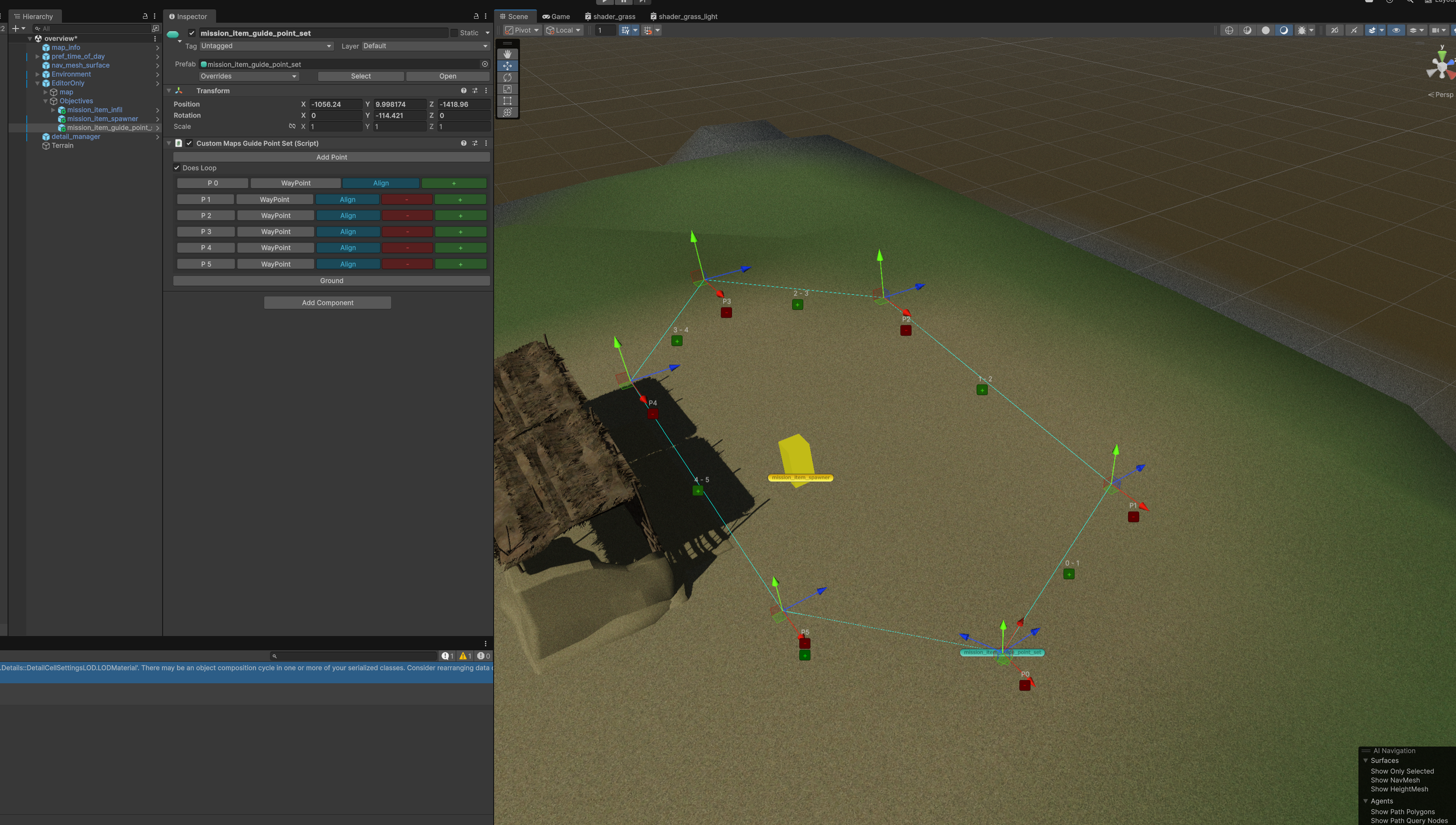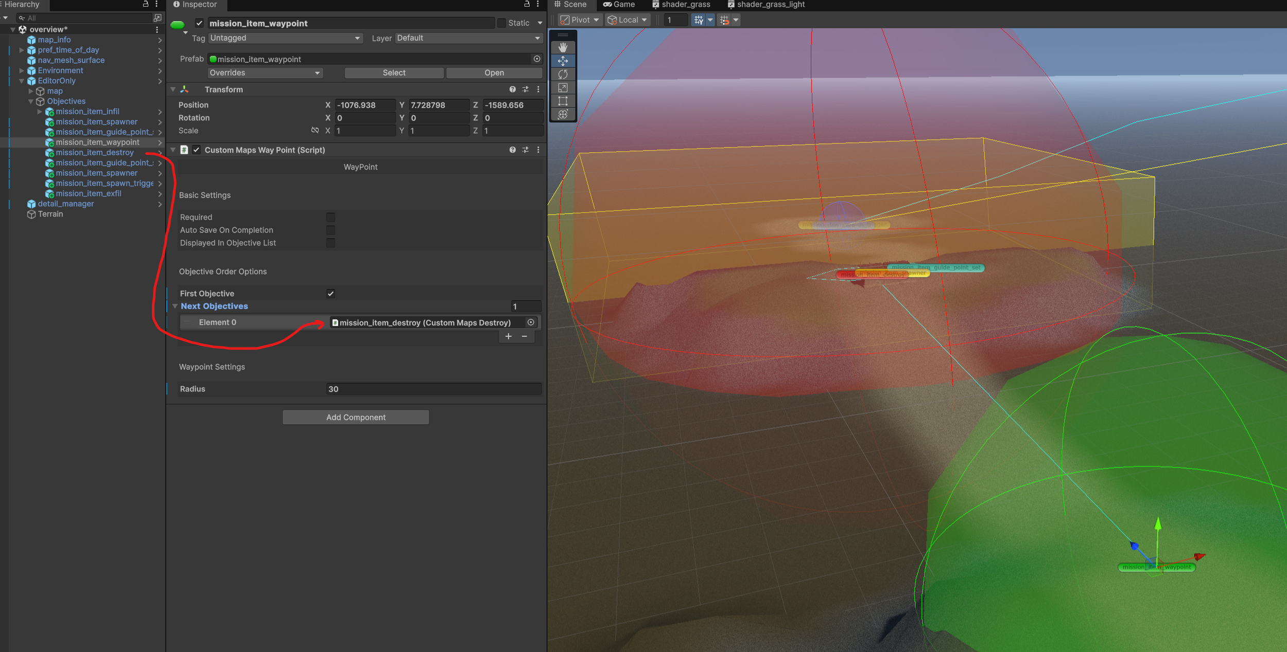 6: We’ll place the first Objective now. A Simple WayPoint. Same as before, drag a “mission_item_waypoint” into the scene and parent it to the “Objectives” object.