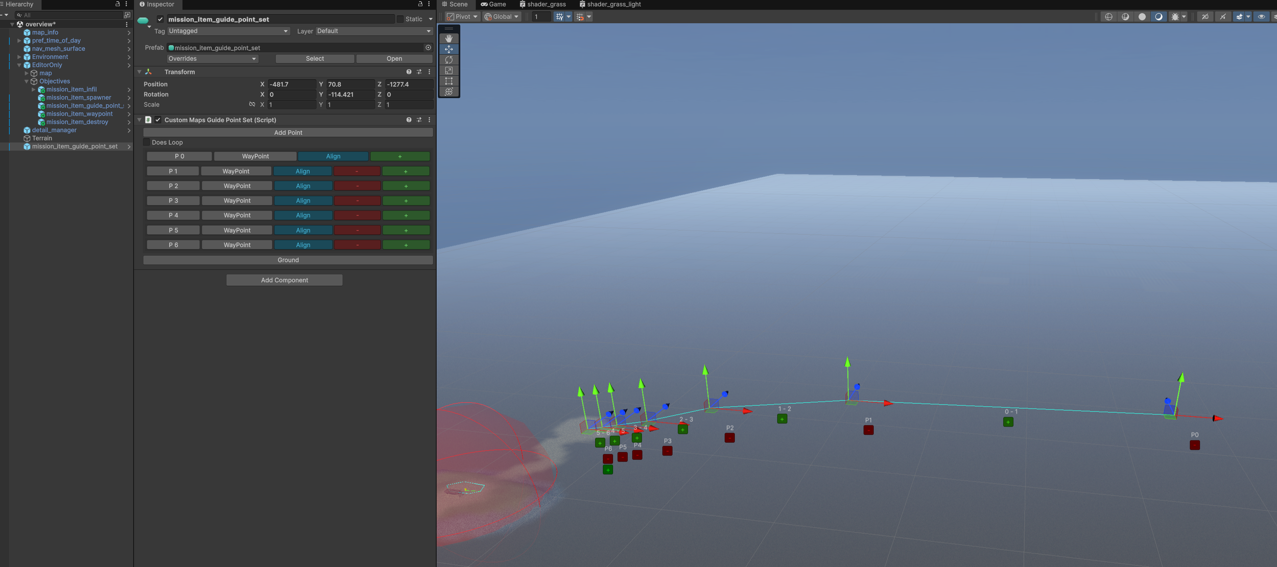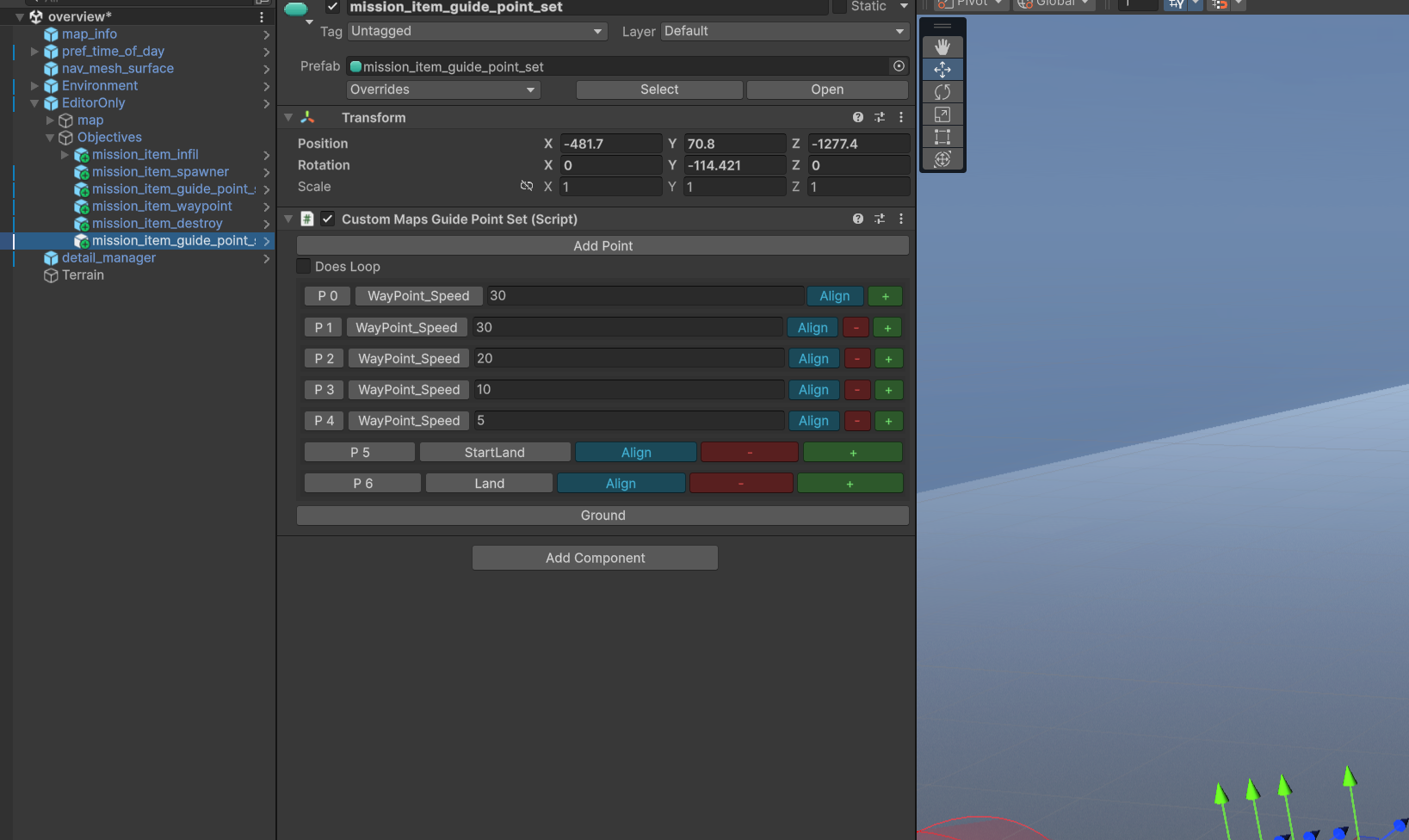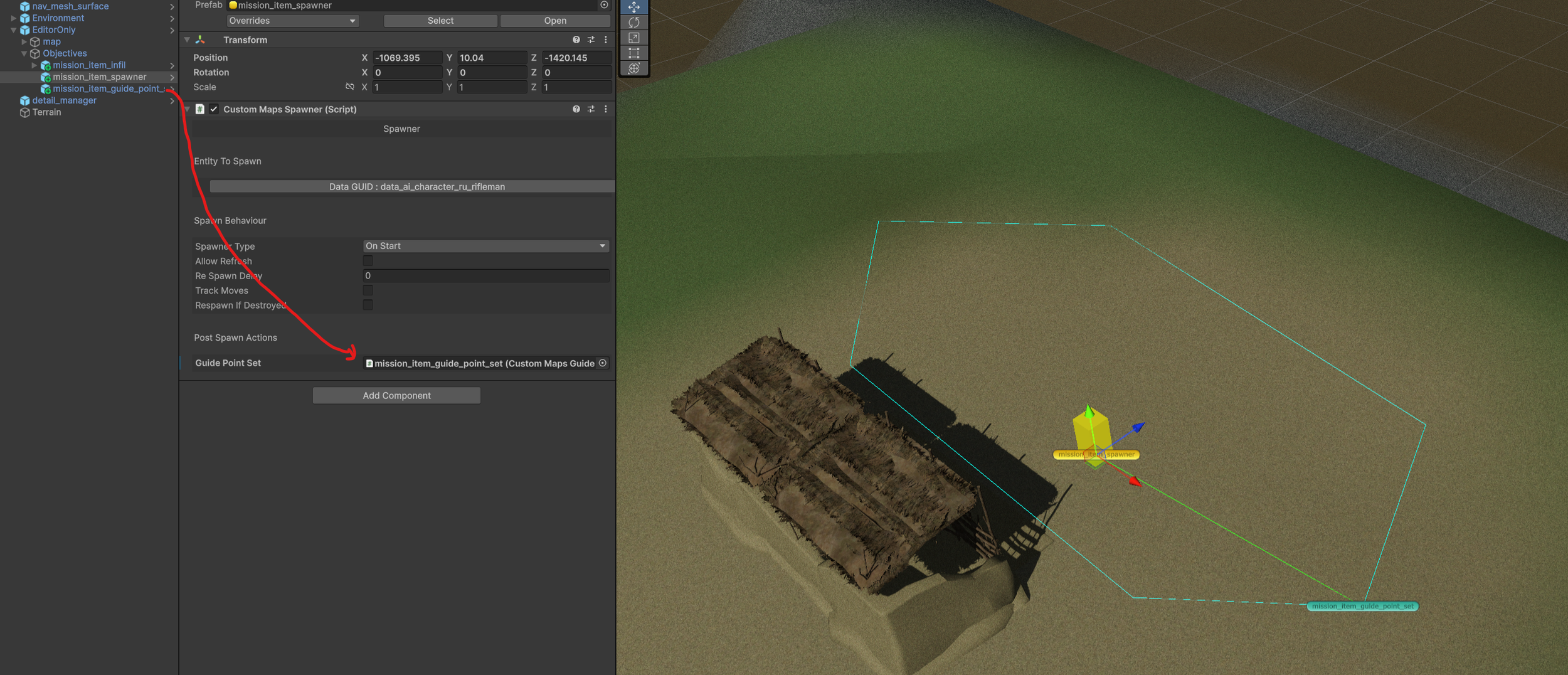 5: Now we’ll set up a patrol path for the character. Drag a “mission_item_guide_point_set” into the scene near the enemy spawner.