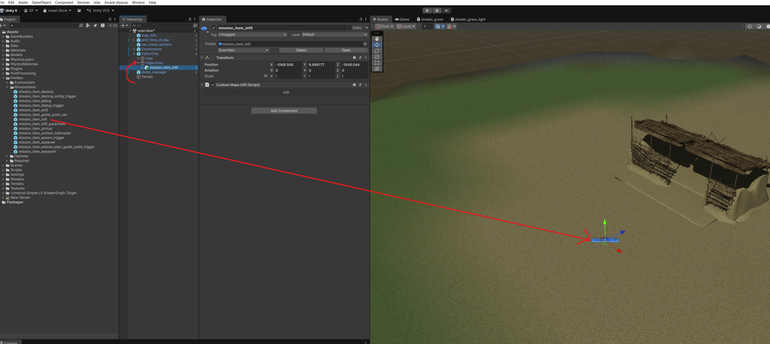 Find the “mission_item_infil” object in the “Assets\Prefabs\MissionItems” folder. Drag it into the scene view to place it. Once you have placed it, drag it in the hierarchy to be under the “Objectives” object in “EditorOnly”.