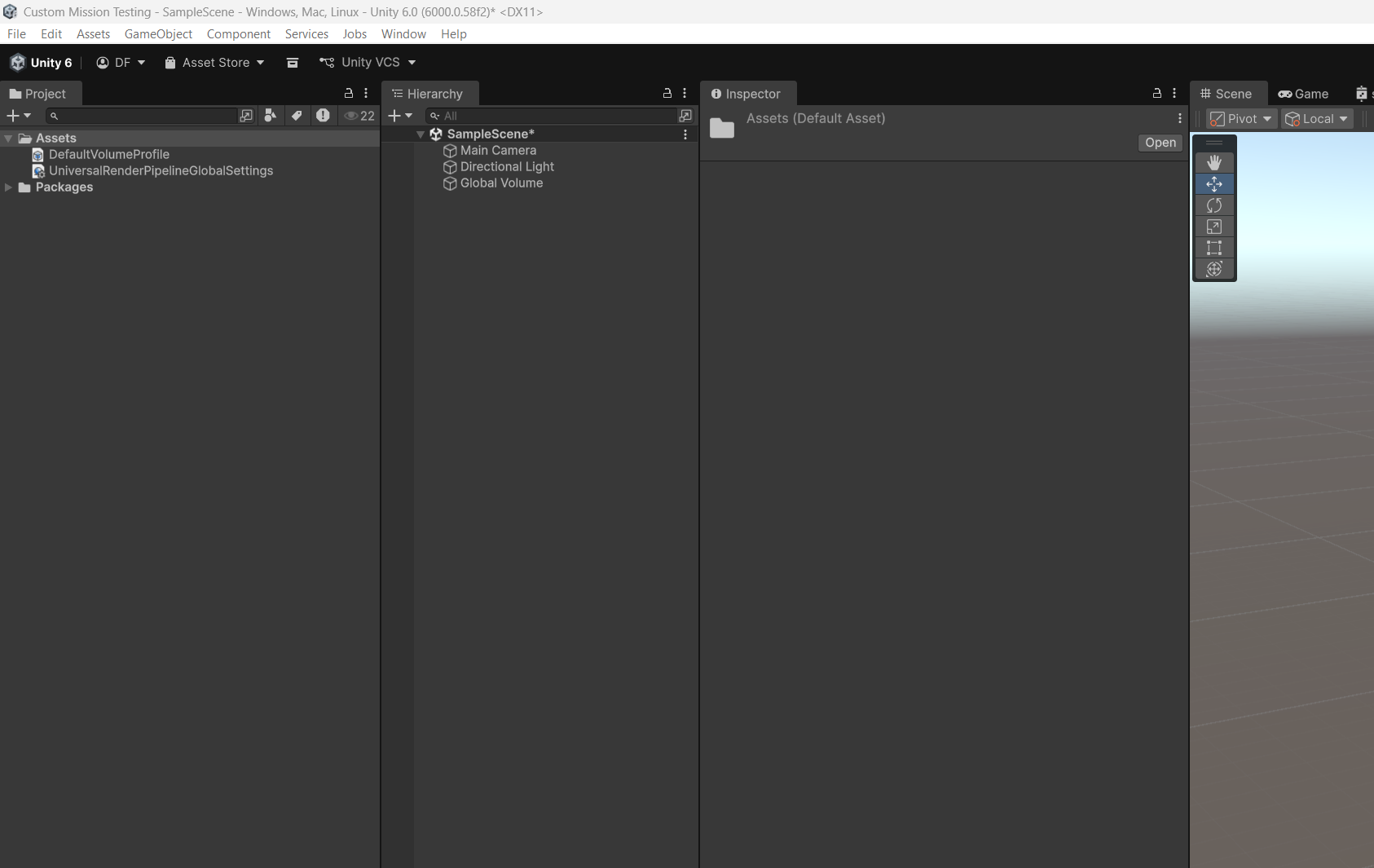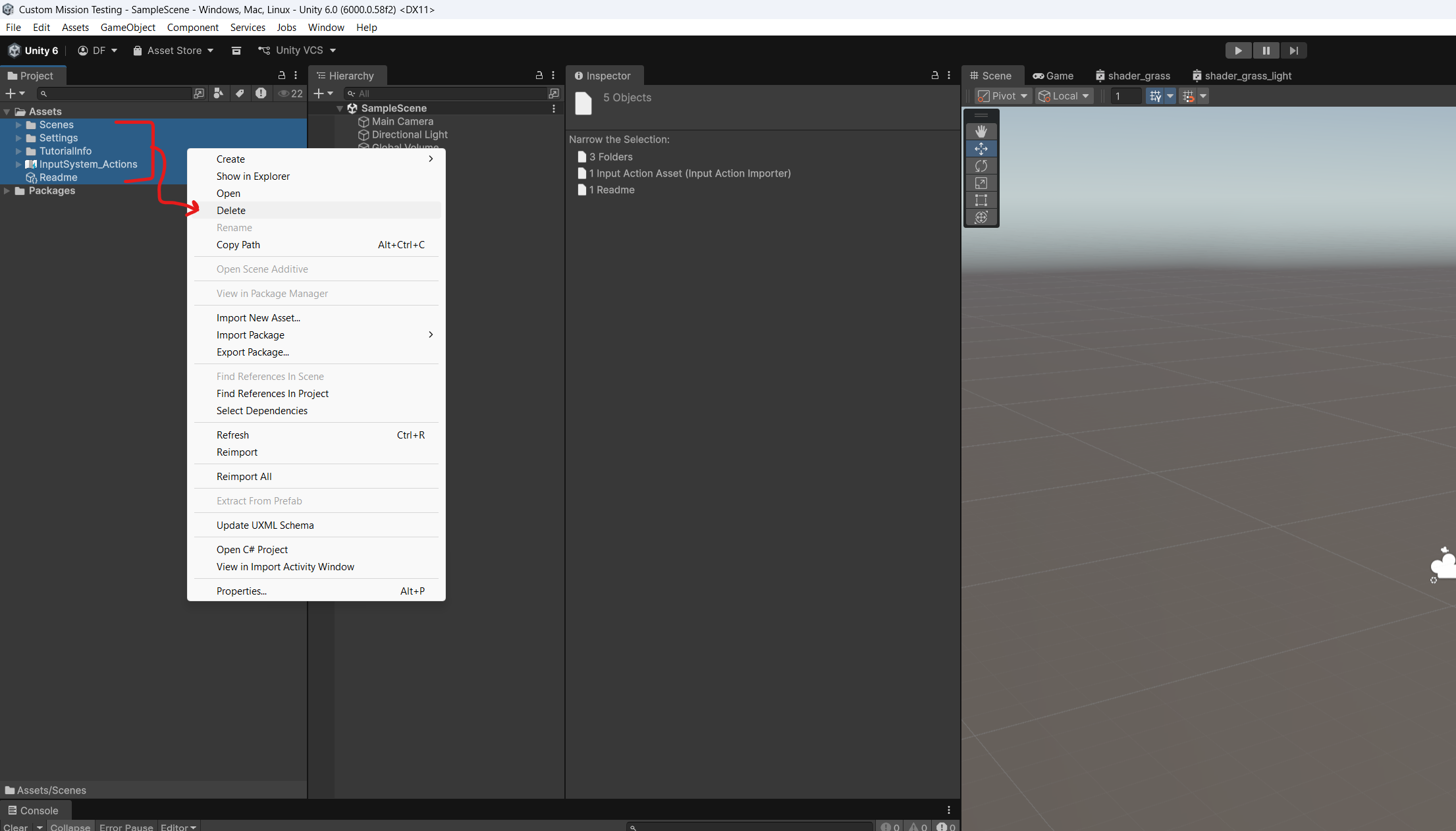 4: Wait for the project to open. Then delete the default assets inside the Assets folder. Select the sub folders and assets, right click, and select delete. It may recreate a couple files when you are done. This is fine.
