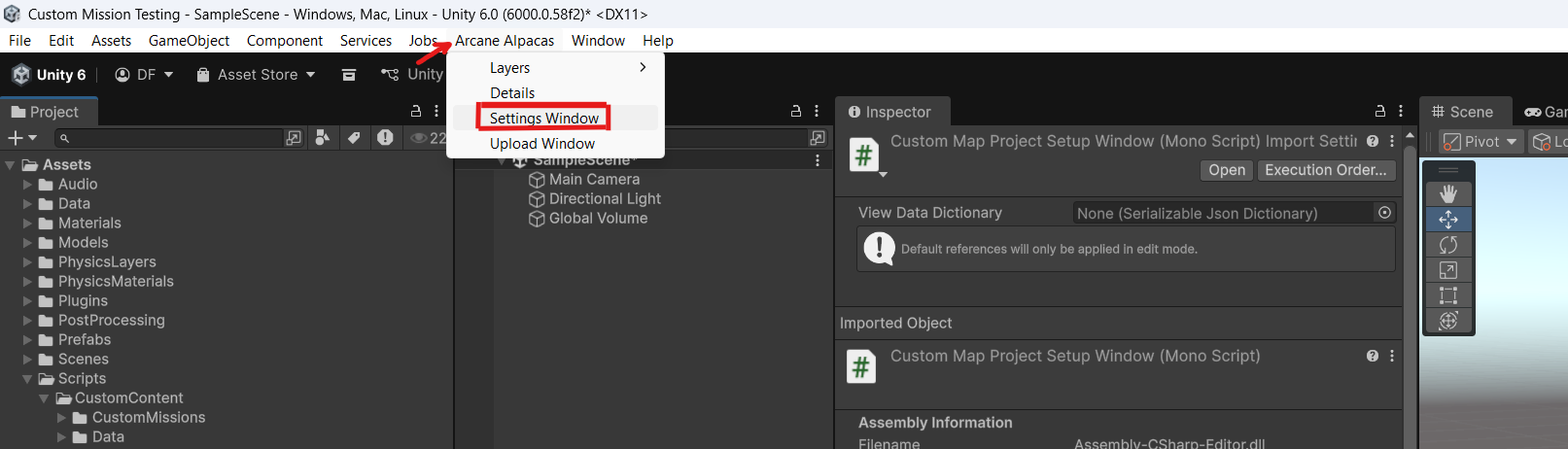 7: Next we’ll set up some settings for the project. Start by opening the Settings Menu Tool: “Arcane Alpacas<Settings Window”.