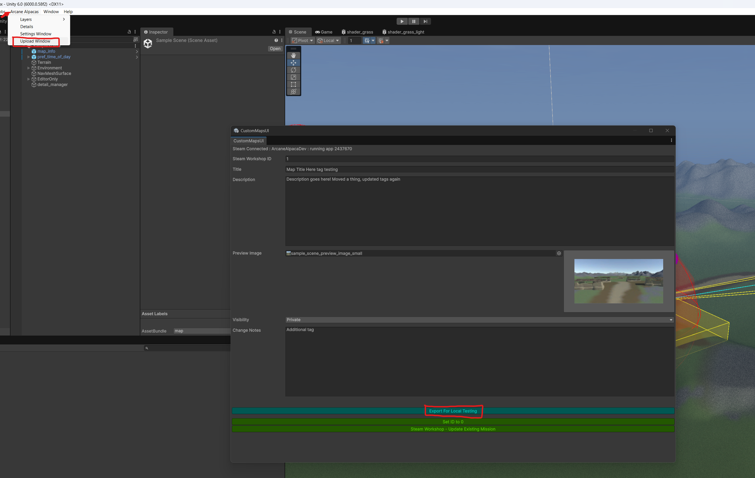 Then open the “Upload Window” and click “Export for Local Testing”.