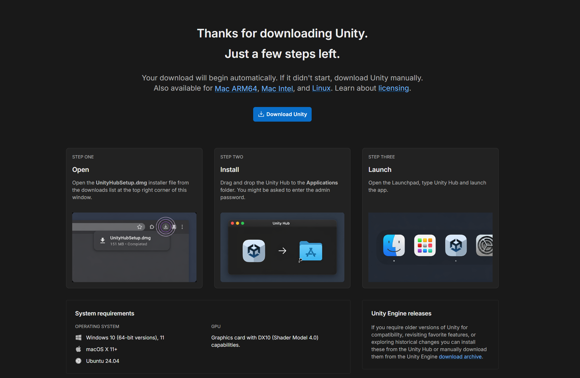 1: Download and install the Unity Hub. You may need to create a Unity account to access the download page. You’ll need a unity account for the later step too.