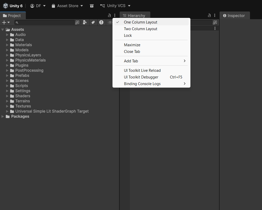 6: Once the import is complete you should see all of the assets in the project window. You can now delete the last two assets in the root Assets folder. If your project window looks different from the screen shot, it may just be set to “Two Column Layout” You can change it by clicking the 3dots on the Project window and selecting “One Column Layout”.